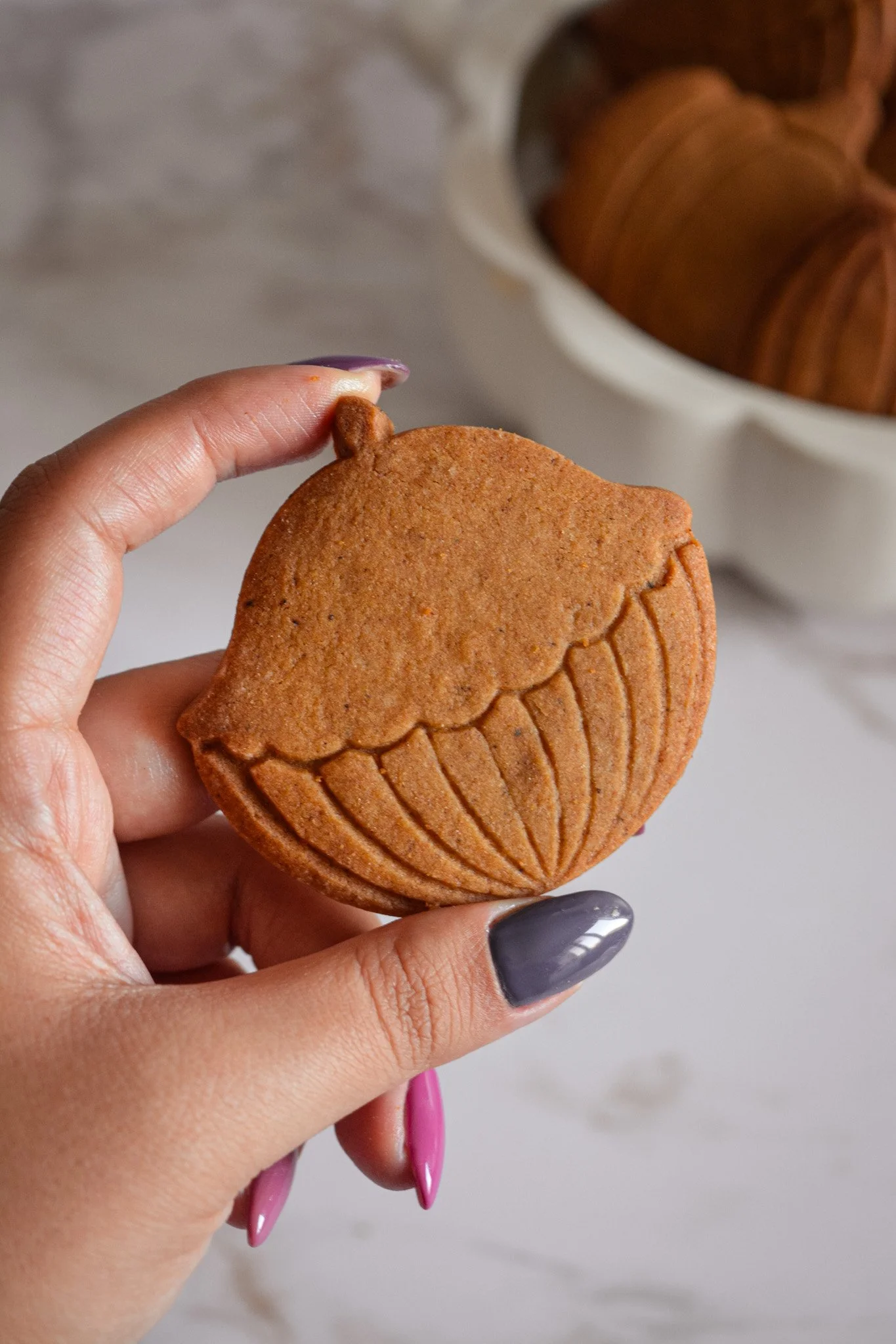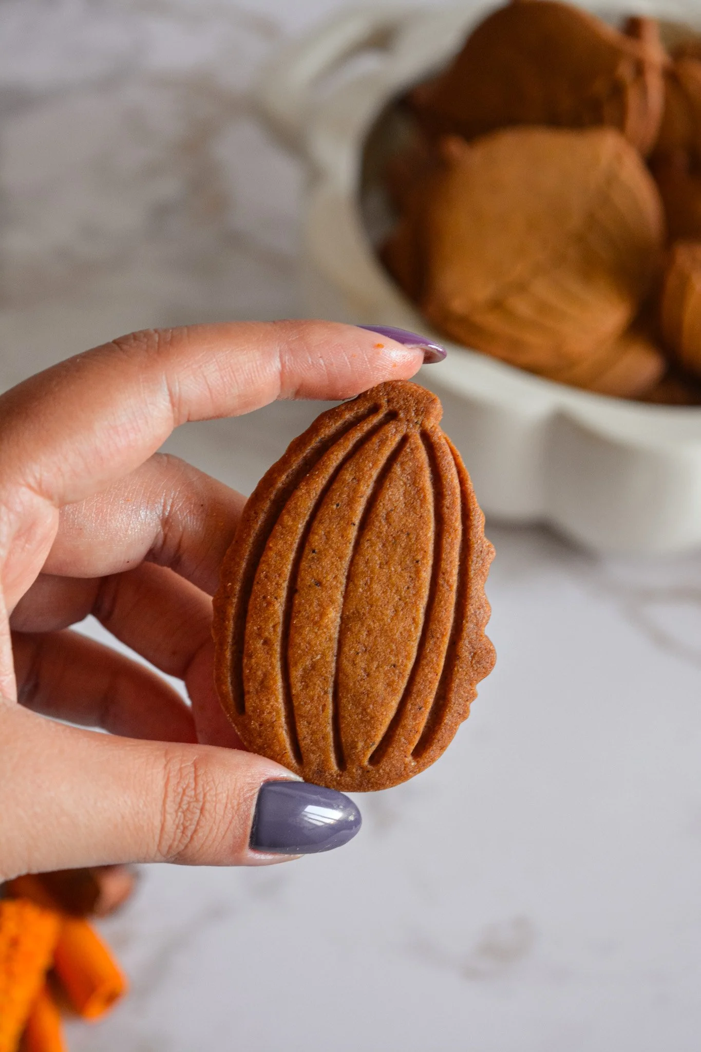 Une main tenant un biscuit en forme de citrouille, avec d'autres biscuits en forme de citrouille dans un bol blanc en arrière-plan.